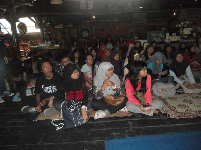 Di tengah acara teman-teman yang datang semakin banyak, ruangan cafe yang sebenarnya cukup luas pun jadi terasa sempit meski sudah disediakan tempat untuk lesehan dan bangku-bangku. Prambanan langsung mengingatkan bahwa di sini telah disediakan teh manis, air mineral juga camilan untuk teman-teman. Awalnya mereka malu-malu dan saling menunggu untuk mengambil snacks, tapi setelah ada yang memulai dalam hitungan menit langsung habis. Gue bahkan nggak kebagian teh manisnya, hihihi (haus, lol). Sambil menikmati camilan acara tanya jawab pun dilanjutkan. Teman-teman sepertinya nggak pernah kehabisan stock pertanyaan untuk diajukan. Bahkan semua hadiah dibagikan pun masih banyak yang ingin bertanya, hehehe. Oya, untuk yang bisa menjawab pertanyaan dan mengajukan pertanyaan memang disediakan hadiah. Ada novel ke tiga gue "Guruku Berbulu dan Berekor" juga lolipop dari film Mika. Nggak nyangka meski di Jogja masa tayang Mika sudah habis, tapi sebagian besar teman-teman di sini sudah menontonnya dan mereka hapal dengan adegan-adegannya, hihihi :)