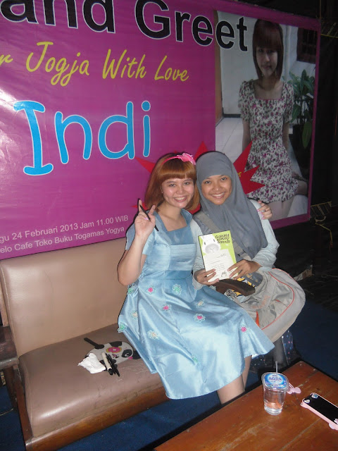 Gue langsung memilih siapa yang akan menemani gue di sana. Bapak atau Ibu. Setelah menimbang-nimbang, akhirnya gue memilih Bapak karena beliau sangat suka mendokumentasikan gue, hehehe. Kesempatan ini juga berarti pertemuan pertama gue dengan keluarga Homerian Pustaka! Iya, sejak pertama kali kami bertemu di dunia maya dan gue ditawari kontrak untuk novel "Waktu Aku sama Mika" pada tahun 2009, ini adalah pertemuan perdana kami yang secara nyata, bukan hanya lewat tulisan atau suara. Gue agak sedikit malu-malu pada awalnya, karena berbicara secara langsung rasanya berbeda dengan lewat internet atau telepon. Syukurlah mereka sangat ramah dan membuat gue merasa seperti di rumah.Bahkan mengajak gue dan Bapak untuk makan malam bersama ketika kami baru saja tiba. Belum apa-apa gue sudah merasa betah di Jogja dan semakin nggak sabar menunggu pagi untuk bertemu dengan teman-teman pembaca di sini :)